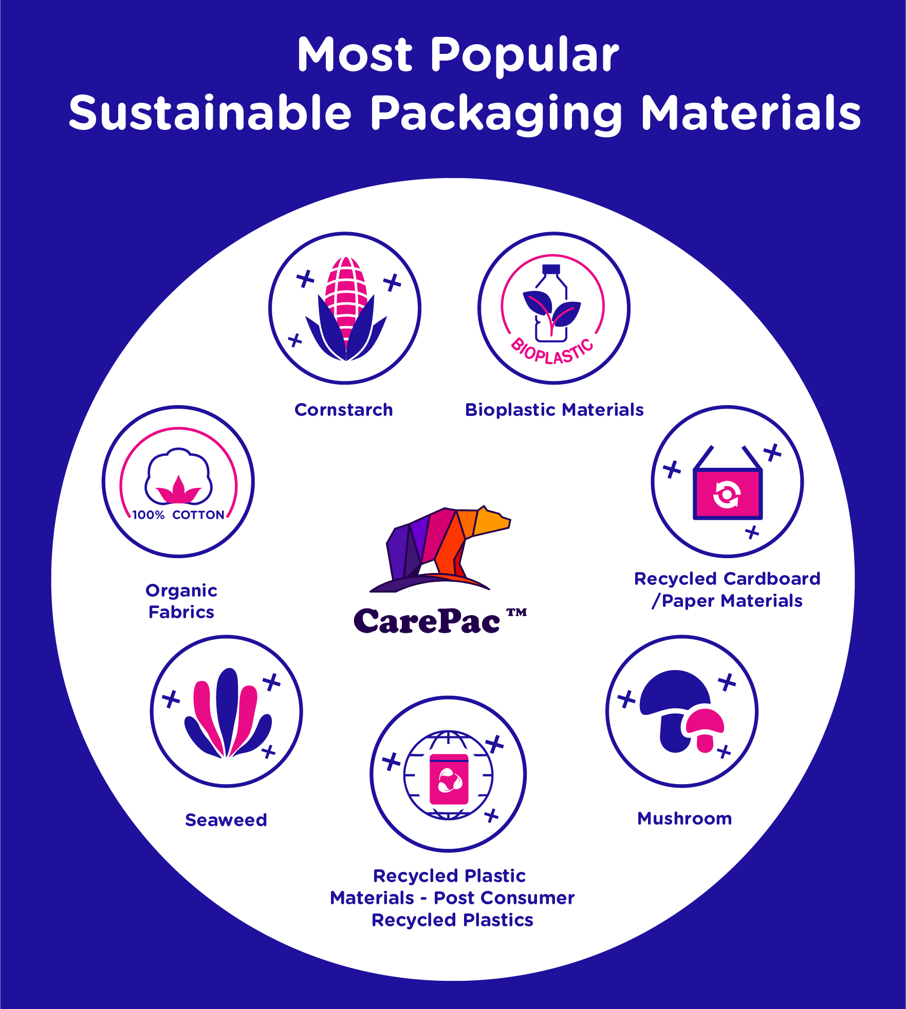 The packaging market has dived into more creative materials sourced from plants, including cornstarch, mushroom, and seaweed packaging. Typically, these products are more likely to be eco-friendly because they may be compostable, or break-down much faster than traditional plastics. The production of these materials is also usually better for the environment, in that it leads to less greenhouse gas emissions released. Due to increased demand and a need to preserve the environment, many packaging companies (like us!) are developing a variety of recyclable, compostable and biodegradable packaging options for businesses to capitalize on.